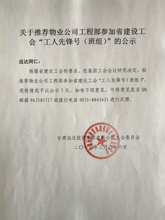 關(guān)于推薦物業(yè)公司工程部參見省建設(shè)工會“工人先鋒號(班組)”的公示