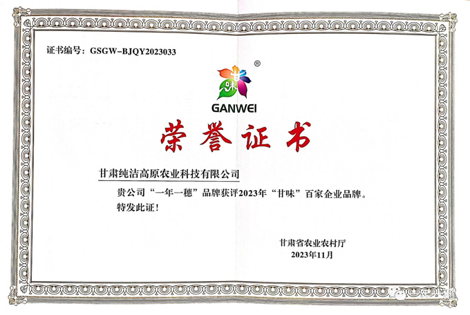 會上,省農(nóng)業(yè)農(nóng)村廳黨組成員、副廳長翟自宏發(fā)布2023“甘味”十大區(qū)域公用品牌和100家甘味企業(yè)品牌,發(fā)布2023年入選《“甘味”農(nóng)產(chǎn)品品牌目錄》的區(qū)域公用品牌、企業(yè)商標(biāo)品牌。甘肅純潔高原農(nóng)業(yè)科技有限公司“一年一穗”品牌獲2023年“甘味”百家企業(yè)品牌,并授予榮譽證書。