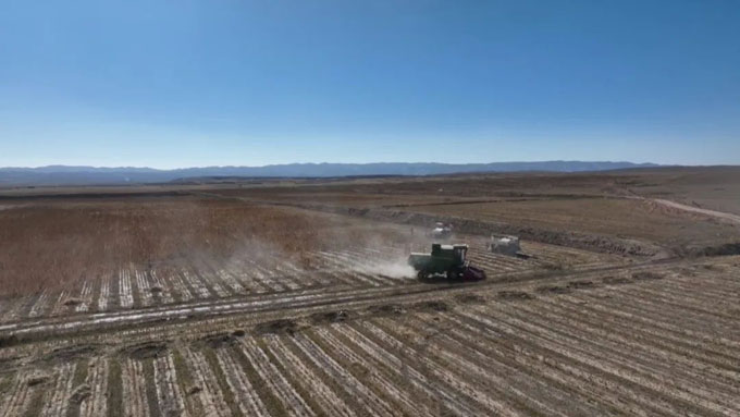 伴隨著收割機(jī)隆隆的轟鳴聲,脫粒后的藜麥從收割機(jī)倉(cāng)門傾瀉而下。