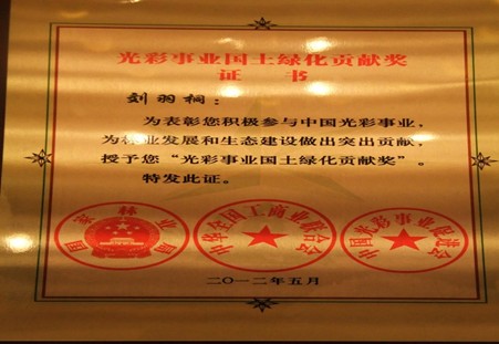 2012年 5月28日,中國光彩會四屆三次理事會在京隆重召開,全國政協(xié)副主席、中央統(tǒng)戰(zhàn)部部長、中國光彩事業(yè)促進(jìn)會會長杜青林,全國政協(xié)副主席、全國工商聯(lián)主席、中國光彩事業(yè)促進(jìn)會顧問黃孟復(fù),國家林業(yè)局黨組成員、中央紀(jì)委駐局紀(jì)檢組組長陳述賢等出席會議。會上,由中華全國工商業(yè)聯(lián)合會、國家林業(yè)局、中國光彩事業(yè)促進(jìn)會聯(lián)合對全國第四屆“光彩事業(yè)國土綠化貢獻(xiàn)獎(jiǎng)”進(jìn)行了表彰,全國有44位企業(yè)家獲得“光彩事業(yè)國土綠化貢獻(xiàn)獎(jiǎng)”。甘肅遠(yuǎn)達(dá)投資集團(tuán)有限公司董事長劉羽桐女士榮獲中國第四屆“光彩事業(yè)國土綠化貢獻(xiàn)獎(jiǎng)”。