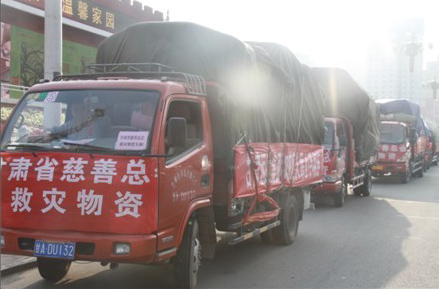 甘肅遠達集團救災物資車隊集合完畢,準備出發(fā)
