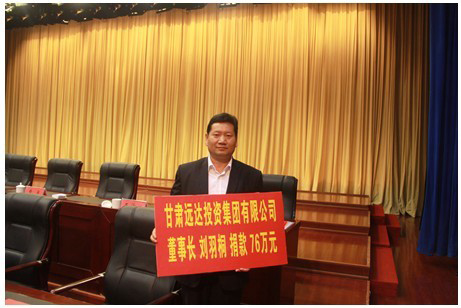 2013年9月11日由甘肅省委統(tǒng)戰(zhàn)部、省工商聯(lián)、省光彩會共同組織主辦的 “同心·光彩隴原行禮縣活動”在甘肅禮縣舉行。甘肅省副省長、省工商聯(lián)主席郝遠(yuǎn)出席此次活動。甘肅遠(yuǎn)達(dá)投資集團(tuán)副總裁宋佩新代表集團(tuán)董事長劉羽桐向禮縣貧困地區(qū)捐款76萬元。