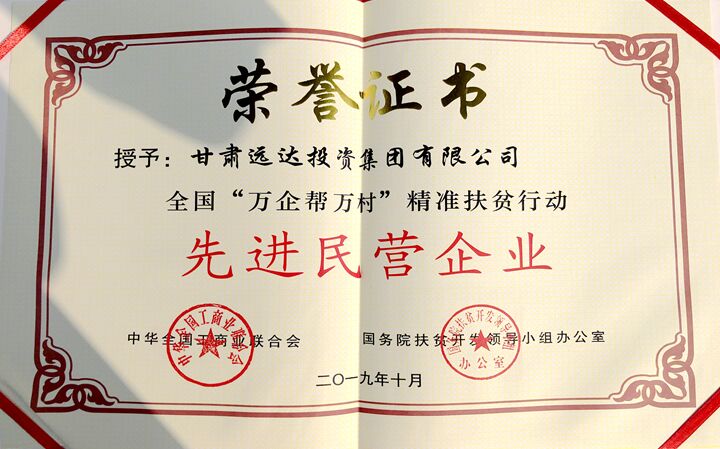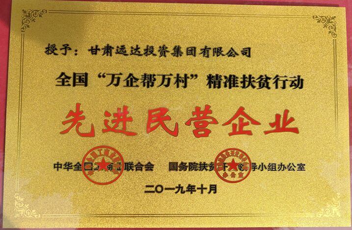 2019年10月17日,由全國工商聯(lián)、國務(wù)院扶貧辦在京召開貫徹落實習近平總書記重要回信精神座談會暨2019年全國“萬企幫萬村”精準扶貧行動先進民營企業(yè)表彰大會,甘肅遠達集團榮獲全國"萬企幫萬村"精準扶貧行動先進民營企業(yè)稱號,劉羽桐董事長出席表彰大會并接受表彰。